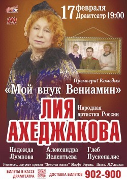 17 февраля в Калининграде – легендарная Лия Ахеджакова! На сцене Драматического театра - премьера комедии об истории одной семьи «Мой внук Вениамин». «Звездная» команда авторов: Людмила Улицкая – автор пьесы, Марфа Горвиц – номинант на премию «Золотая маска» за лучшую режиссерскую работу в драматическом театре, режиссер. На сцене – народная артистка России Лия Ахеджакова, Александра Ислентьева, Надежда Лумпова, Глеб Пускепалис.