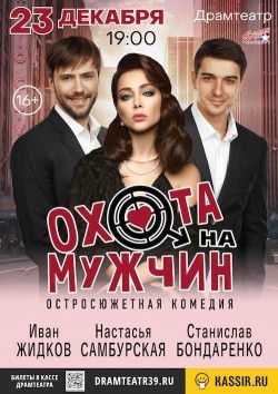 В главной роли – впервые в Калининграде – актриса, певица, телеведущая и один из самых популярных блогеров страны – Настасья САМБУРСКАЯ. Также на одной сцене с ней – молодые мужчины, о которых мечтает практически каждая женщина страны – Станислав Бондаренко и Иван Жидков. Спектакль настолько востребован в России, что гастроли в городах следуют день за днем и расписаны на месяцы вперед. Во многих регионах проект ждут уже в третий раз. 23 декабря – в преддверии Нового года на сцене Калининградского драматического театра «Охота на мужчин» для вас!